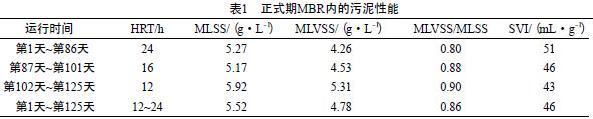 在模試運(yùn)行期間,正式期的第53天將MBR內(nèi)的泥水混合液排出21 L,第75天和第83天各排出10L,其他時間處于不排泥狀態(tài),MBR內(nèi)的污泥性能見表1。由表1可見,在整個MBR運(yùn)行的正式期,污泥體積指數(shù)(SVI)小于100 mL/g,表明污泥的沉降性能較好;MLVSS/MLSS較高,表明污泥的活性高;隨HRT的縮短,MLVSS增加,這是因為單位時間內(nèi)去除的有機(jī)物的量有所提高。MBR內(nèi)MLSS的平均值為5.52 g/L,MLVSS的平均值為4.78 g/L。