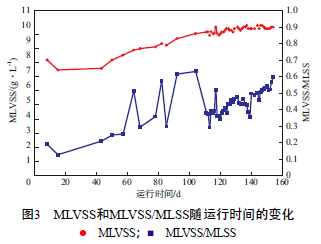 MLVSS和MLVSS/MLSS隨運(yùn)行時間的變化見圖3。由圖3可見:在馴化期內(nèi),由于廢水中的DMSO對菌種有抑制作用,MLVSS逐漸減小;隨著活性污泥對廢水的逐漸適應(yīng),在正式期內(nèi)MLVSS隨運(yùn)行時間的延長而逐漸增大;MLVSS/MLSS也是經(jīng)過馴化期的短暫降低后,在正式期隨運(yùn)行時間的延長而逐漸增大,運(yùn)行到第110天時(包括30 d馴化期)基本穩(wěn)定在0.89,說明污泥活性較高。