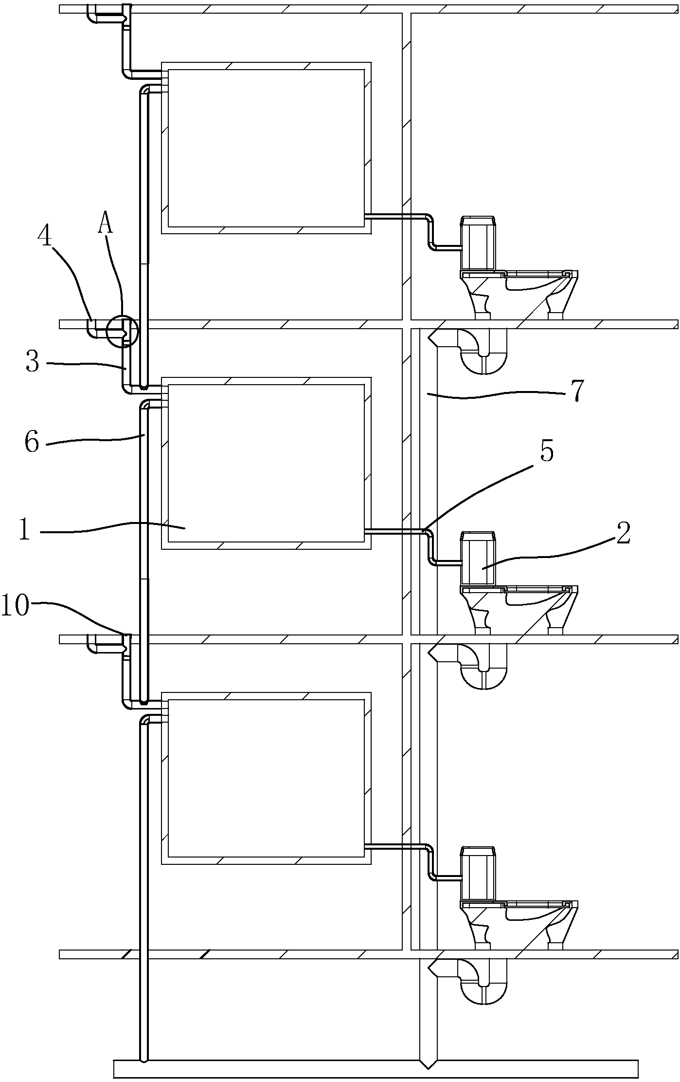 優選的,所述蓄水箱頂部連接有溢水管,所述溢水管連接于下一樓層的蓄水箱上的污水管。