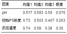 在單因素實驗基礎上利用正交試驗進行實驗優化,采用3因素3位級正交試驗,正交試驗方案與試驗結果分析見表 1和表 2.由表 1和表 2可確定PS氧化反應中各因素對有機物去除率影響的強弱順序為:溫度>初始PS濃度>pH.其中,溫度的極差為0.36,高于其他因素,是影響有機物去除效果的主要因素.由此得到比較適宜的PS氧化條件為:pH為5.0,初始PS濃度為1000 mg · L-1,反應溫度為75 ℃.