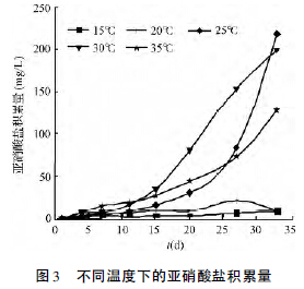 將數月前做好的載體放置于反應器中,溫度分別控制在15、20、25、30 和35℃下。在圖3 中,比較初階段NO2-濃度都在10 mg /L 以下,表明載體存放時間過長會造成AOB 活性降低,因此要注意載體存放的條件,可加少許營養液,維持微生物的活性。此實驗過程可以看作是AOB 再次馴化的過程,更能體現溫度對AOB 與NOB 活性的影響。