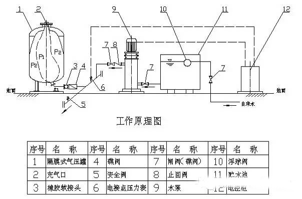 系統中定壓點壓力確定:定壓點壓力的高低要考慮兩個因素,一個是系統運行時任一點都不超壓,二是系統停運時系統不倒空。如果定壓點的壓力過高,系統中的每一點的壓力也就相應的增高,導致管道、閥門或設備等在高壓下運行,出現強度破壞或疲勞損壞。壓力設置太低,系統就會倒空出現氣堵,而導致介質循環不暢。氣壓罐工作壓力值按以下方法確定(推薦) (1)補水泵啟動壓力P1: P1=Po+0.005;“Po”系統比較高點壓力 (2)補水泵停泵壓力P2: