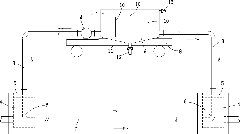 技術(shù)人員介紹,該系統(tǒng)包括盛放污水的箱體、排污泵、連接水管以及兩個軟性堵頭,排污泵通過連接水管與箱體相聯(lián)接,軟性堵頭設(shè)置在污水井中;在軟性堵頭中設(shè)置有彎管,彎管的一端與連接水管相通,其另一端與污水井的管道口相通;兩個軟性堵頭分別設(shè)置在相鄰的兩個污水井中,其另一端通過污水井的管道相通,一個軟性堵頭通過連接水管與排污泵相聯(lián)接,另一個軟性堵頭通過連接水管與箱體相聯(lián)接。