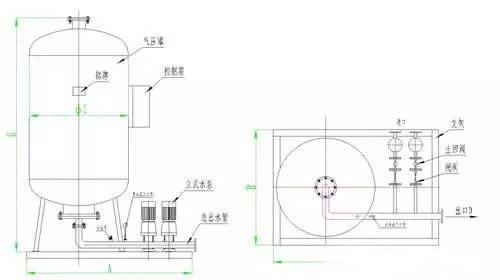 系統中定壓點壓力確定:定壓點壓力的高低要考慮兩個因素,一個是系統運行時任一點都不超壓,二是系統停運時系統不倒空。如果定壓點的壓力過高,系統中的每一點的壓力也就相應的增高,導致管道、閥門或設備等在高壓下運行,出現強度破壞或疲勞損壞。壓力設置太低,系統就會倒空出現氣堵,而導致介質循環不暢。氣壓罐工作壓力值按以下方法確定(推薦) (1)補水泵啟動壓力P1: P1=Po+0.005;“Po”系統最高點壓力 (2)補水泵停泵壓力P2: